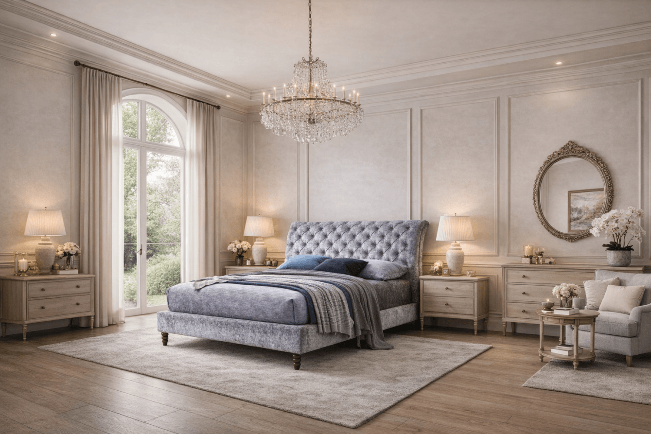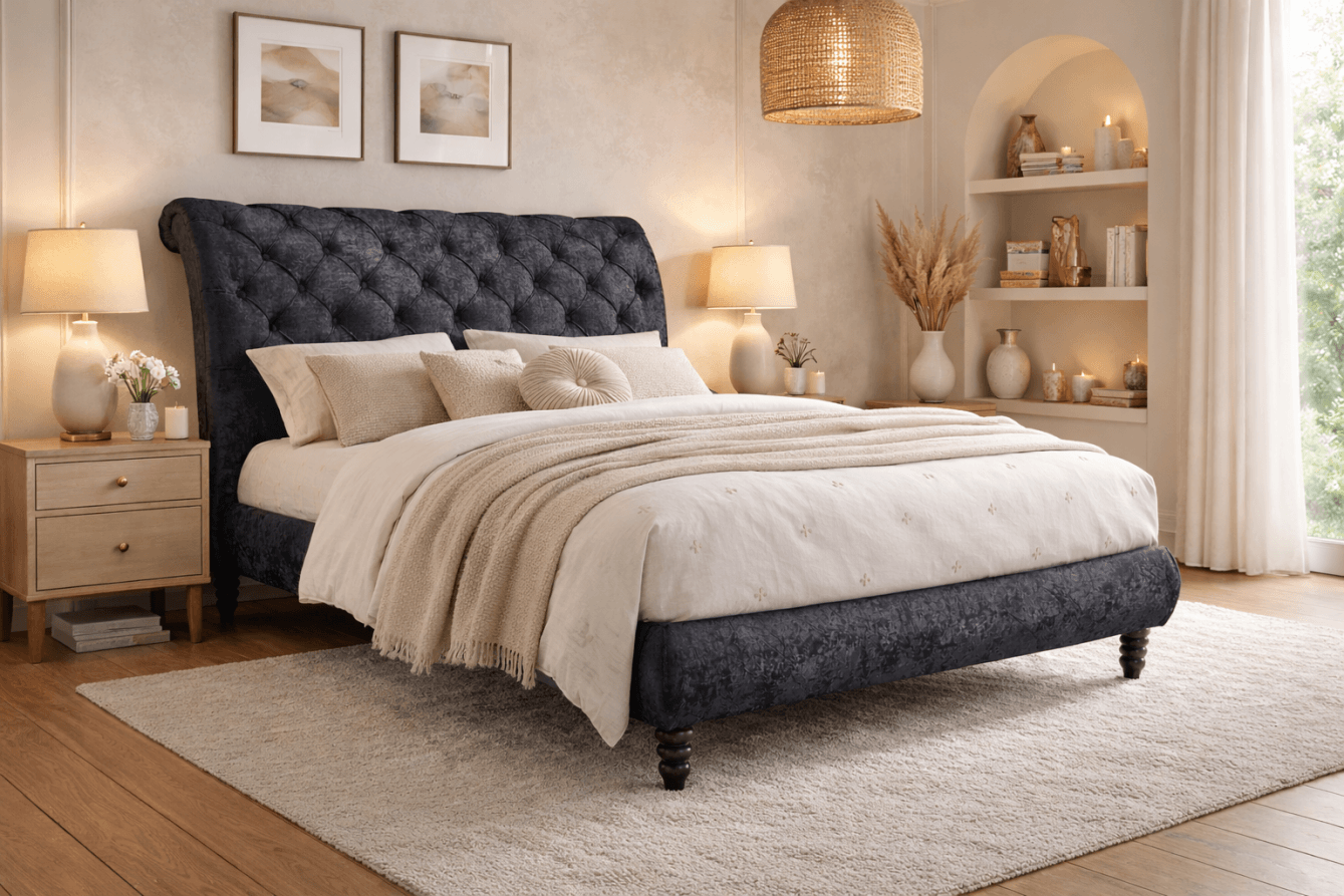 The Venice waterbed is an example of a simple yet attractive piece. It features stylish stitching detail on a quality Crushed Velvet fabric and is finished in an elegant grey or black. The wood feet add the perfect touch to make this bed frame a perfect fit for your bedroom.